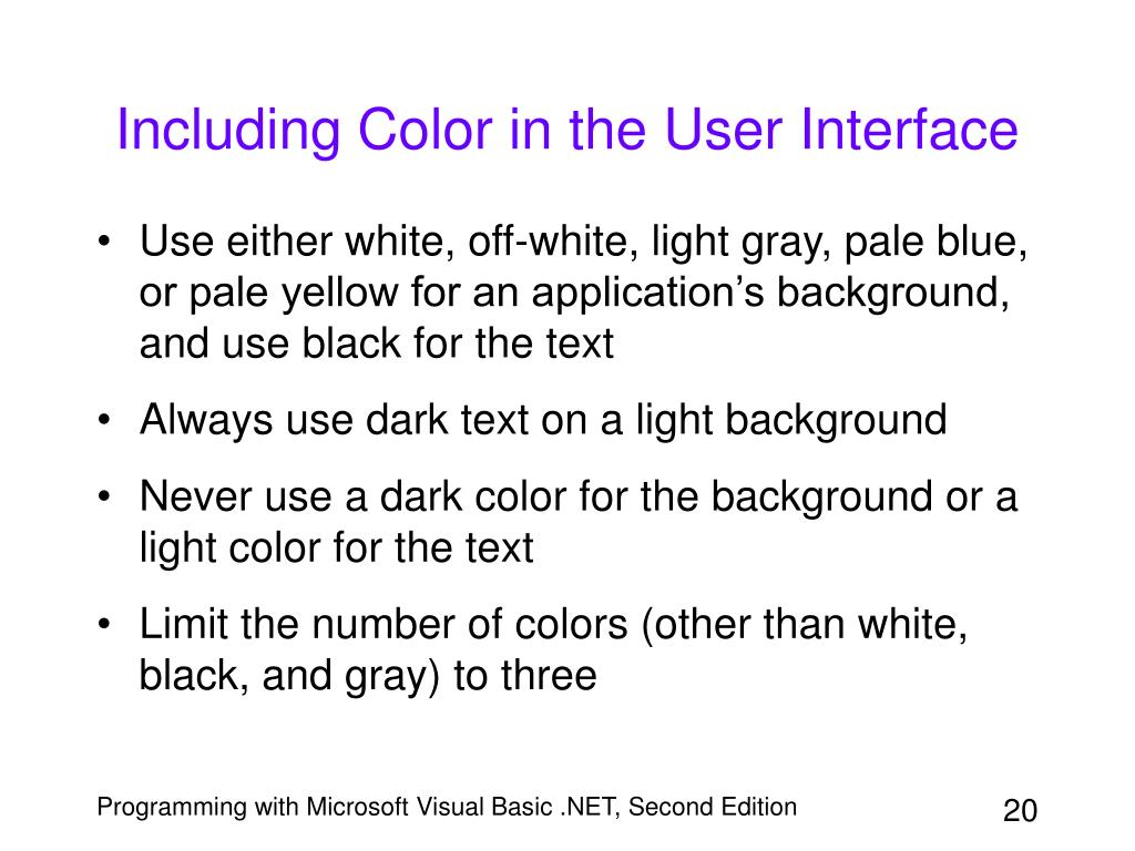 Including Color in the User Interface • Use either white, off-white, light gray, pale blue, or pale yellow for an application’s background, and use black for the text • Always use dark text on a light background • Never use a dark color for the background or a light color for the text • Limit the number of colors (other than white, black, and gray) to three Programming with Microsoft Visual Basic .NET, Second Edition