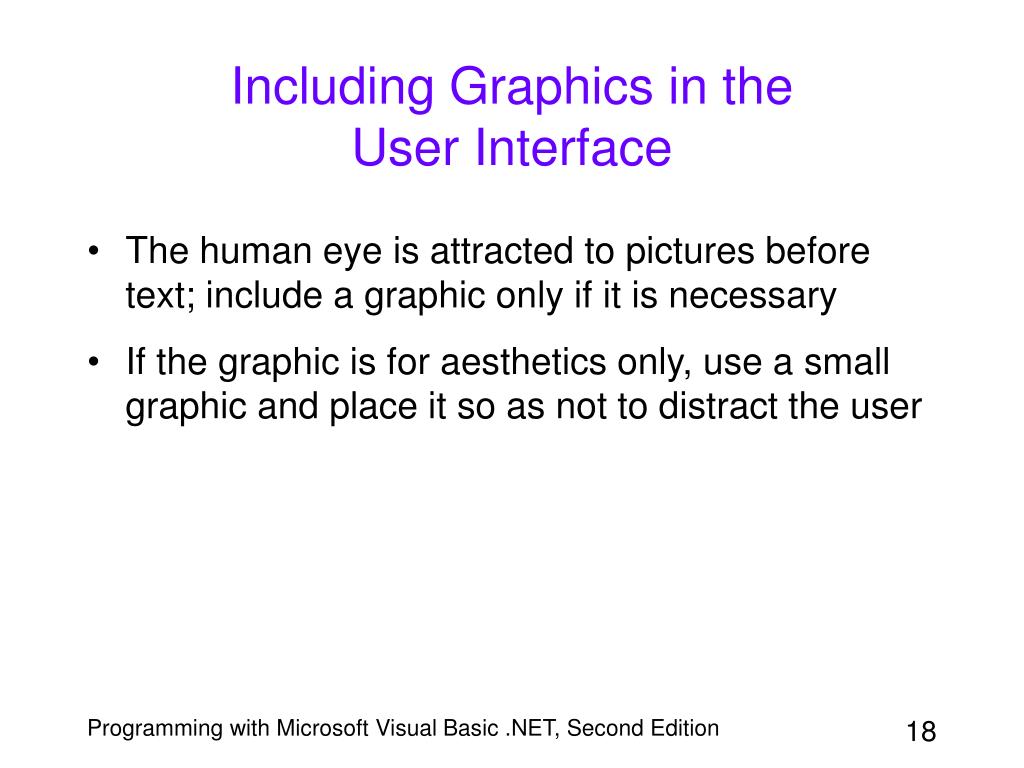 Including Graphics in the User Interface • The human eye is attracted to pictures before text; include a graphic only if it is necessary • If the graphic is for aesthetics only, use a small graphic and place it so as not to distract the user Programming with Microsoft Visual Basic .NET, Second Edition