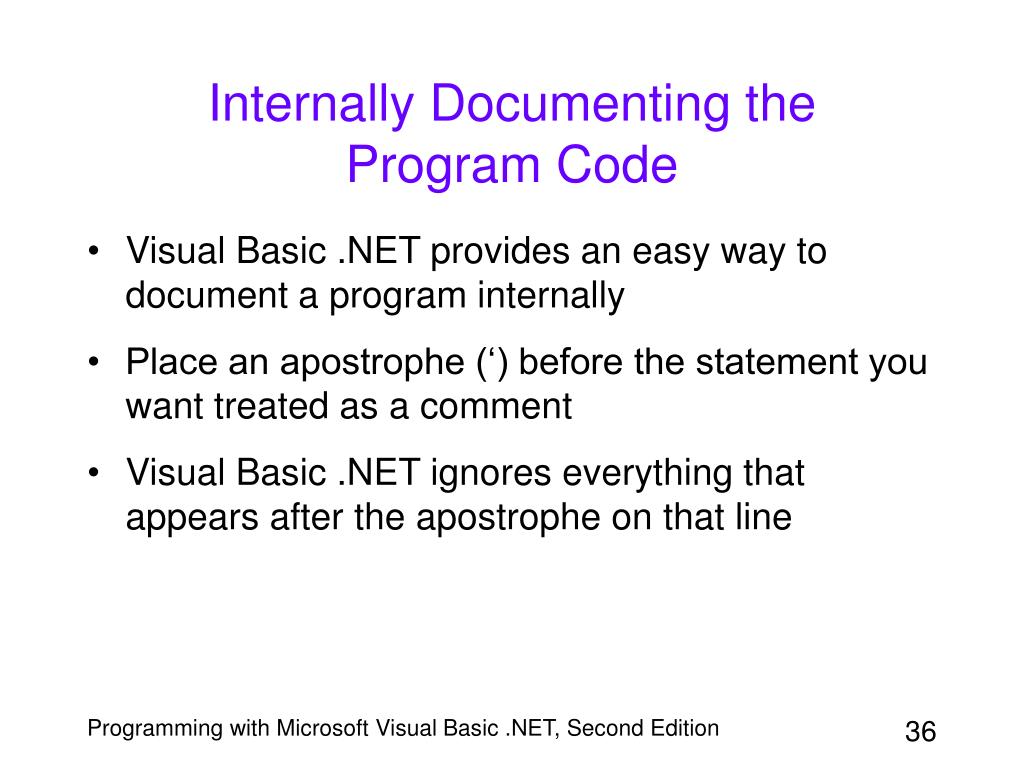 Internally Documenting the Program Code • Visual Basic .NET provides an easy way to document a program internally • Place an apostrophe (‘) before the statement you want treated as a comment • Visual Basic .NET ignores everything that appears after the apostrophe on that line Programming with Microsoft Visual Basic .NET, Second Edition