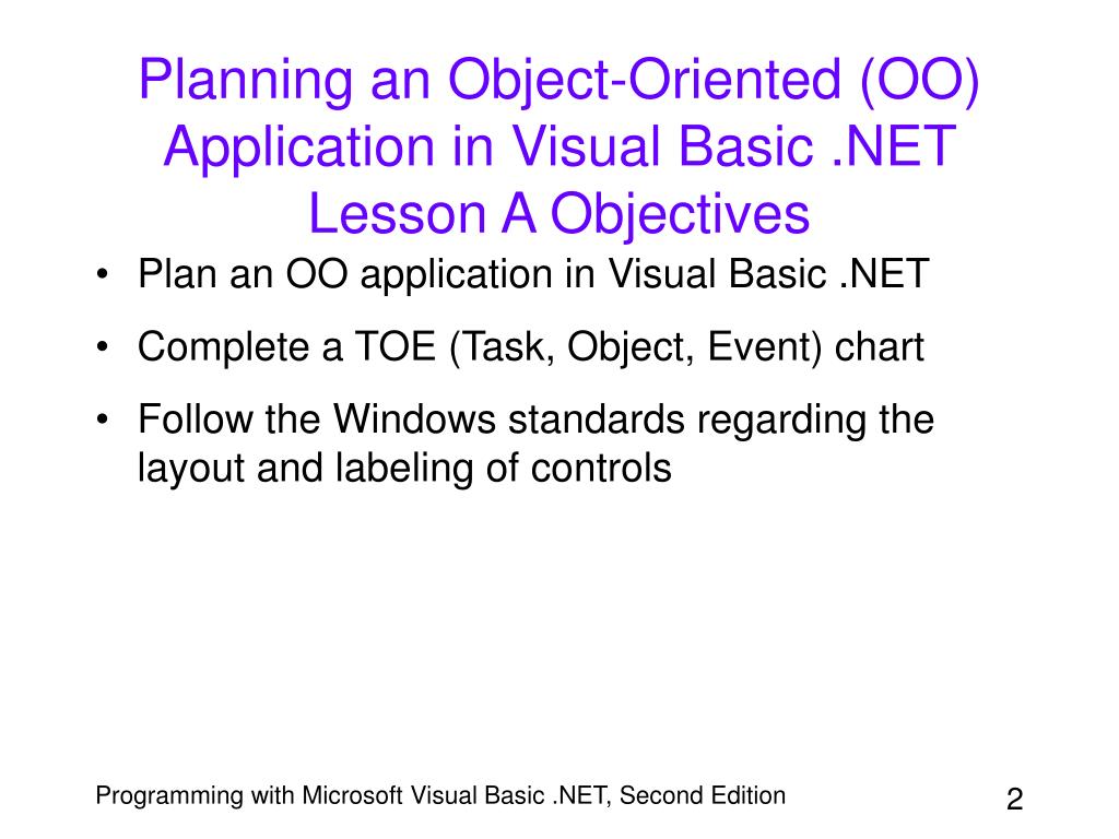 Chapter 2: Designing Applications. Programming with Microsoft Visual Basic .NET, Second Edition. Planning an Object-Oriented (OO) Application in Visual Basic .NET Lesson A Objectives. Plan an OO application in Visual Basic .NET Complete a TOE (Task, Object, Event) chart