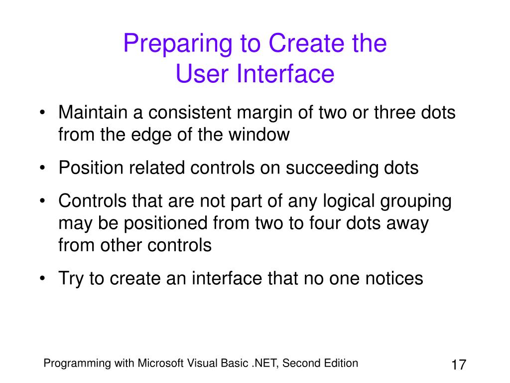 Preparing to Create the User Interface • Maintain a consistent margin of two or three dots from the edge of the window • Position related controls on succeeding dots • Controls that are not part of any logical grouping may be positioned from two to four dots away from other controls • Try to create an interface that no one notices Programming with Microsoft Visual Basic .NET, Second Edition