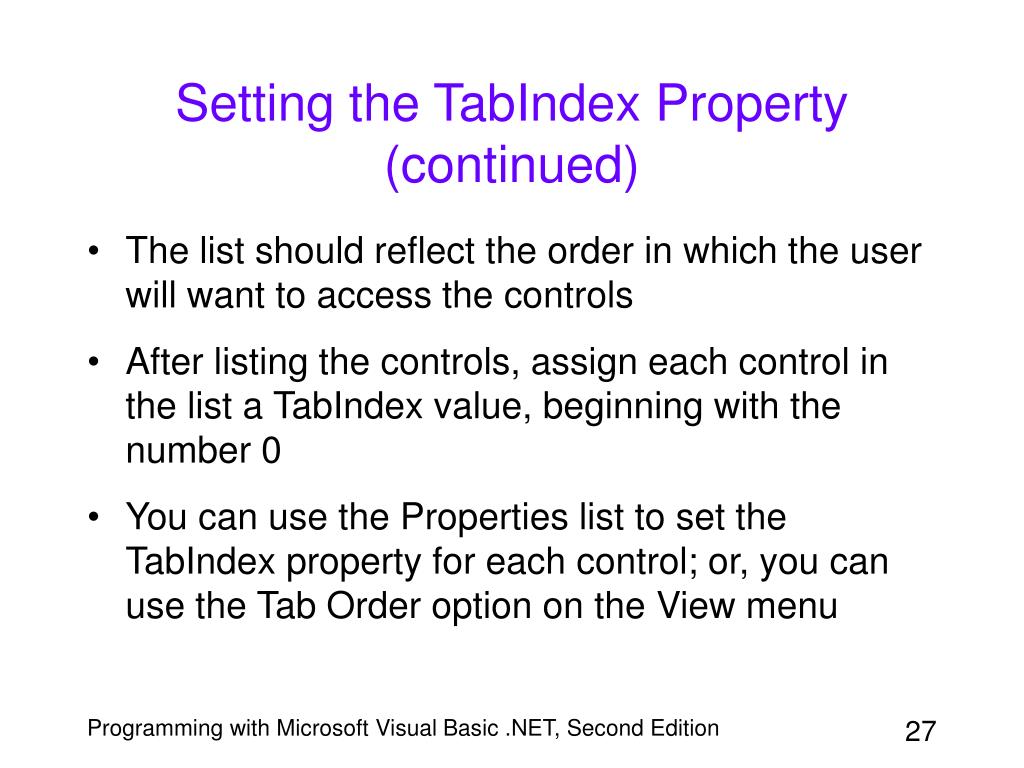 Setting the TabIndex Property (continued) • The list should reflect the order in which the user will want to access the controls • After listing the controls, assign each control in the list a TabIndex value, beginning with the number 0 • You can use the Properties list to set the TabIndex property for each control; or, you can use the Tab Order option on the View menu Programming with Microsoft Visual Basic .NET, Second Edition