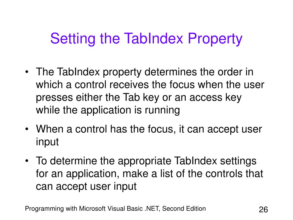 Setting the TabIndex Property • The TabIndex property determines the order in which a control receives the focus when the user presses either the Tab key or an access key while the application is running • When a control has the focus, it can accept user input • To determine the appropriate TabIndex settings for an application, make a list of the controls that can accept user input Programming with Microsoft Visual Basic .NET, Second Edition