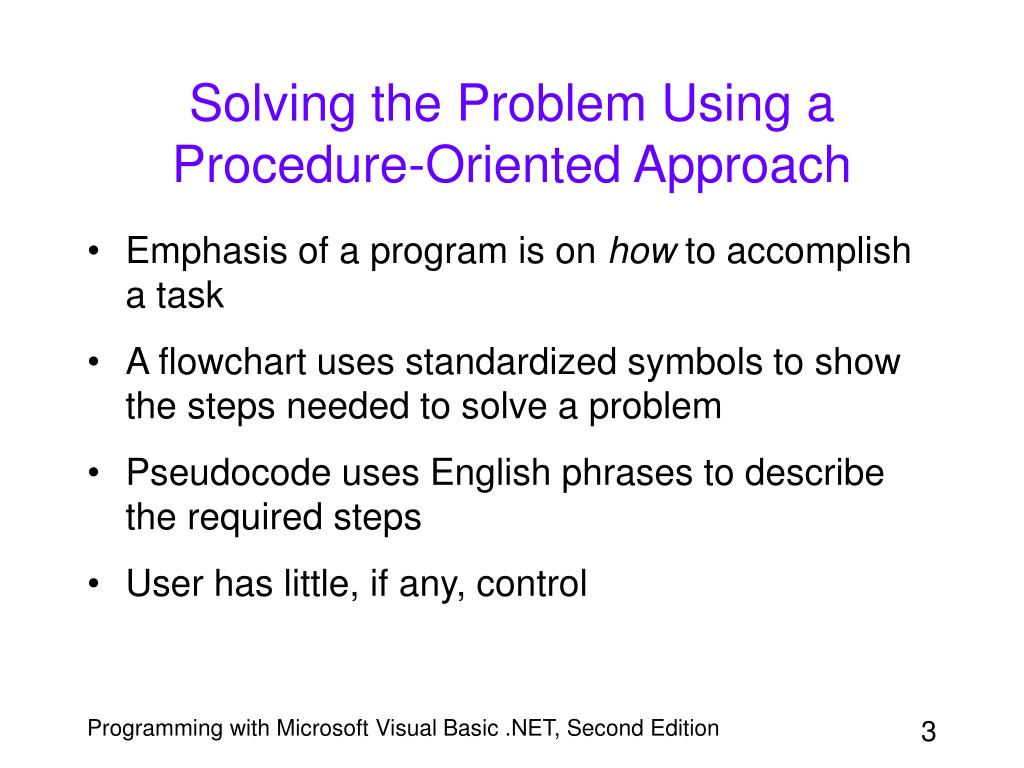 Solving the Problem Using a Procedure-Oriented Approach • Emphasis of a program is on how to accomplish a task • A flowchart uses standardized symbols to show the steps needed to solve a problem • Pseudocode uses English phrases to describe the required steps • User has little, if any, control Programming with Microsoft Visual Basic .NET, Second Edition