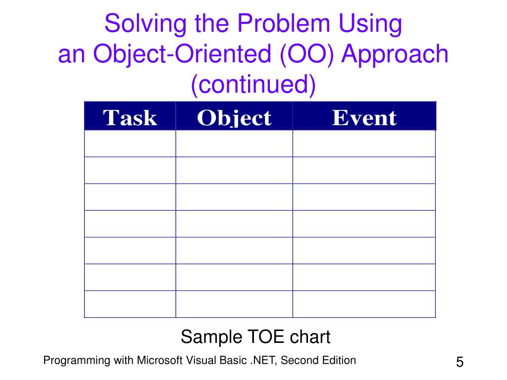 Solving the Problem Using an Object-Oriented (OO) Approach (continued) Sample TOE chart Programming with Microsoft Visual Basic .NET, Second Edition
