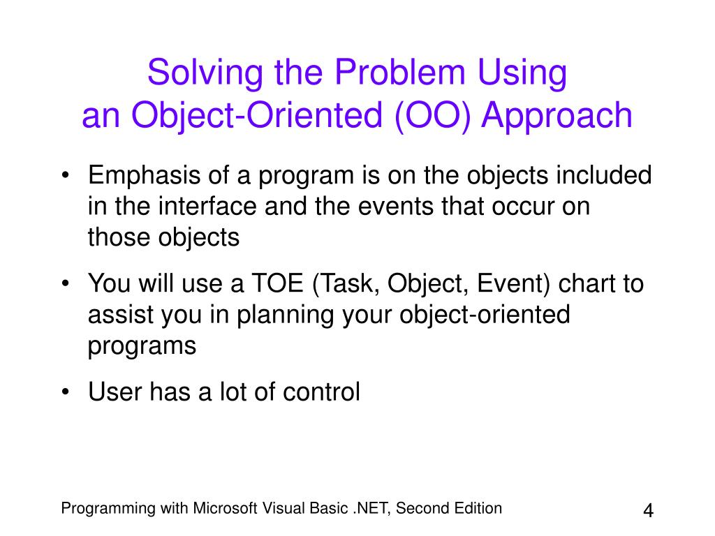 Solving the Problem Using an Object-Oriented (OO) Approach • Emphasis of a program is on the objects included in the interface and the events that occur on those objects • You will use a TOE (Task, Object, Event) chart to assist you in planning your object-oriented programs • User has a lot of control Programming with Microsoft Visual Basic .NET, Second Edition