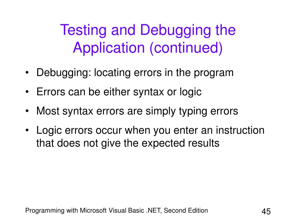 Testing and Debugging the Application (continued) • Debugging: locating errors in the program • Errors can be either syntax or logic • Most syntax errors are simply typing errors • Logic errors occur when you enter an instruction that does not give the expected results Programming with Microsoft Visual Basic .NET, Second Edition