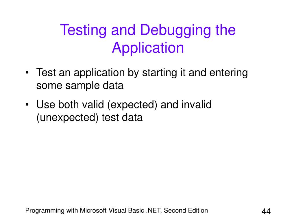 Testing and Debugging the Application • Test an application by starting it and entering some sample data • Use both valid (expected) and invalid (unexpected) test data Programming with Microsoft Visual Basic .NET, Second Edition