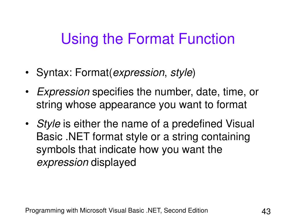 Using the Format Function • Syntax: Format(expression, style) • Expression specifies the number, date, time, or string whose appearance you want to format • Style is either the name of a predefined Visual Basic .NET format style or a string containing symbols that indicate how you want the expression displayed Programming with Microsoft Visual Basic .NET, Second Edition