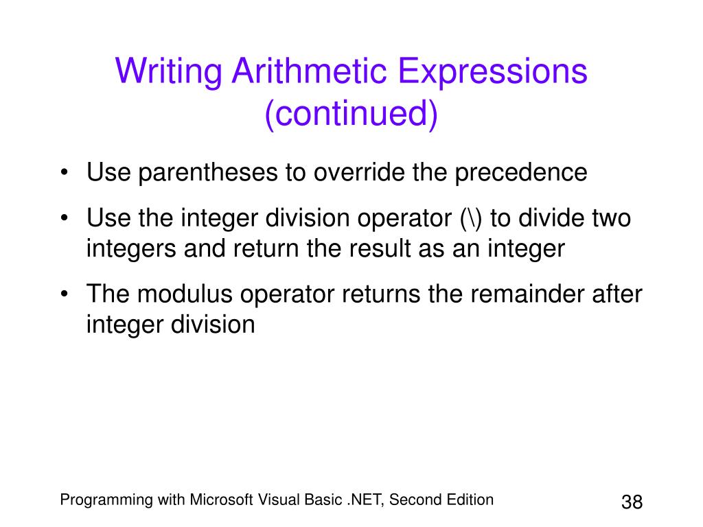 Writing Arithmetic Expressions (continued) • Use parentheses to override the precedence • Use the integer division operator (\) to divide two integers and return the result as an integer • The modulus operator returns the remainder after integer division Programming with Microsoft Visual Basic .NET, Second Edition