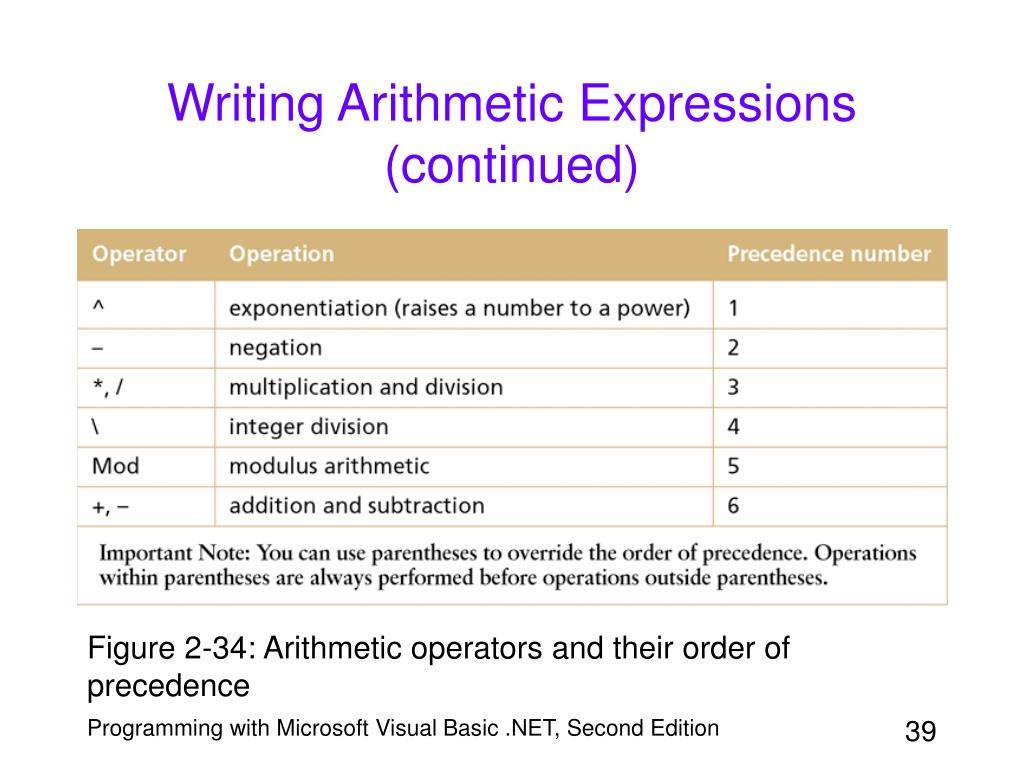 Writing Arithmetic Expressions (continued) Figure 2-34: Arithmetic operators and their order of precedence Programming with Microsoft Visual Basic .NET, Second Edition