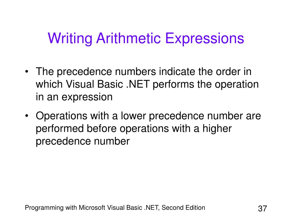 Writing Arithmetic Expressions • The precedence numbers indicate the order in which Visual Basic .NET performs the operation in an expression • Operations with a lower precedence number are performed before operations with a higher precedence number Programming with Microsoft Visual Basic .NET, Second Edition