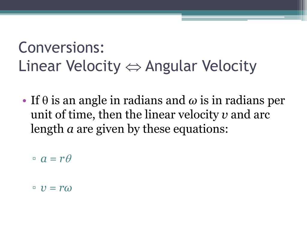 Conversions:Linear Velocity Angular Velocity • If is an angle in radians and ωis in radians per unit of time, then the linear velocity v and arc length a are given by these equations: • a = r • v = rω