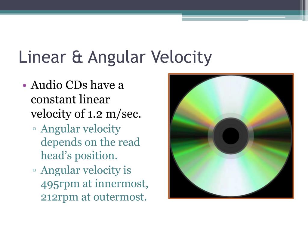 Linear & Angular Velocity • Audio CDs have a constant linear velocity of 1.2 m/sec. • Angular velocity depends on the read head’s position. • Angular velocity is 495rpm at innermost, 212rpm at outermost.