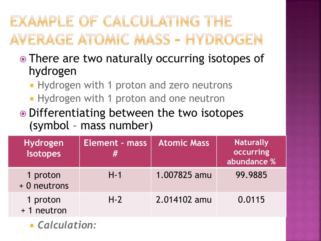 Example of Calculating the Average Atomic Mass – Hydrogen • There are two naturally occurring isotopes of hydrogen • Hydrogen with 1 proton and zero neutrons • Hydrogen with 1 proton and one neutron • Differentiating between the two isotopes (symbol – mass number) • Calculation: