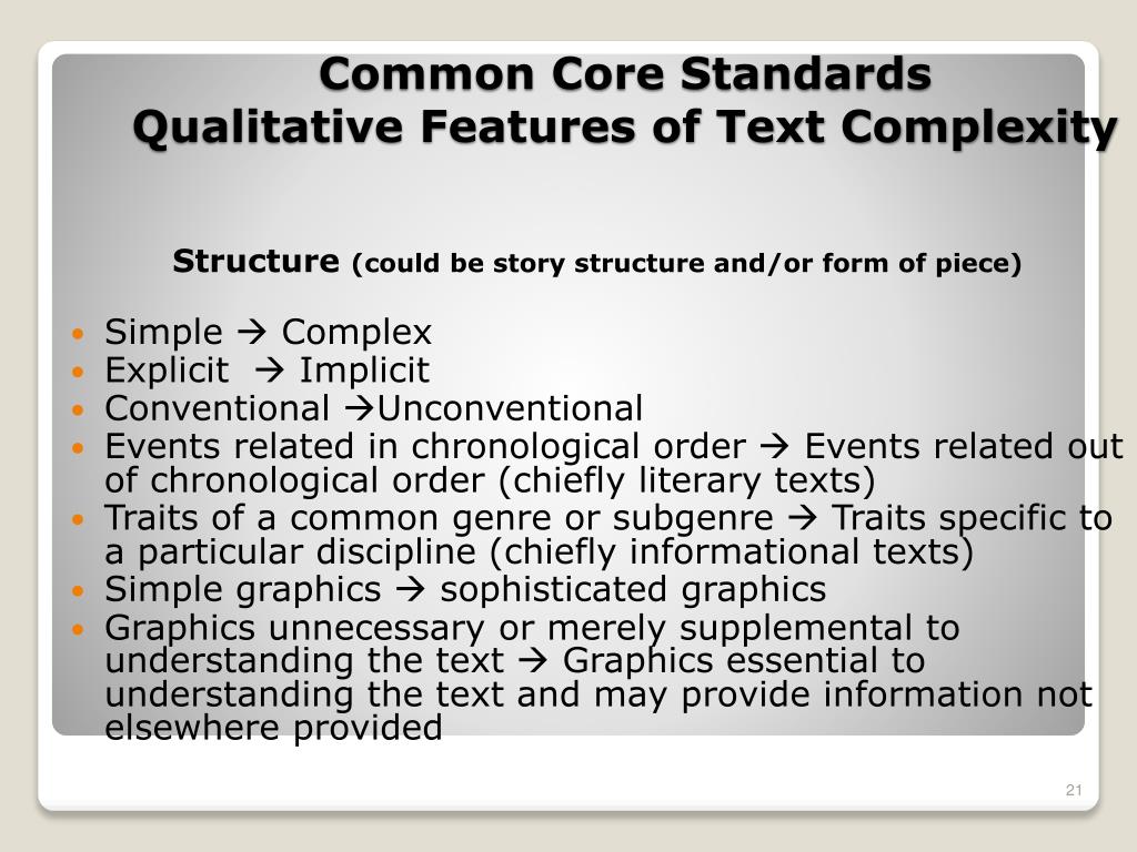 Common Core StandardsQualitative Features of Text Complexity Structure (could be story structure and/or form of piece) • Simple Complex • Explicit Implicit • Conventional Unconventional • Events related in chronological order Events related out of chronological order (chiefly literary texts) • Traits of a common genre or subgenre Traits specific to a particular discipline (chiefly informational texts) • Simple graphics sophisticated graphics • Graphics unnecessary or merely supplemental to understanding the text Graphics essential to understanding the text and may provide information not elsewhere provided