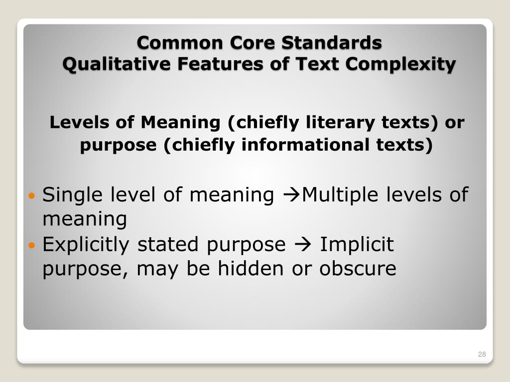 Common Core StandardsQualitative Features of Text Complexity Levels of Meaning (chiefly literary texts) or purpose (chiefly informational texts) Single level of meaning Multiple levels of meaning Explicitly stated purpose Implicit purpose, may be hidden or obscure
