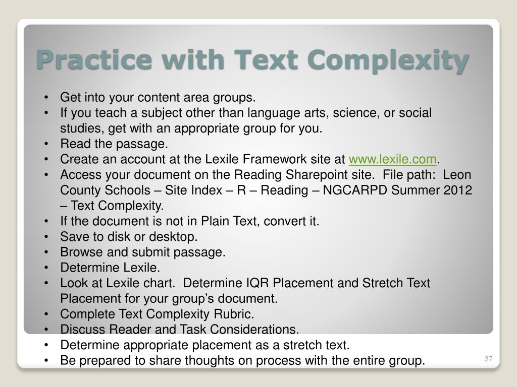 Get into your content area groups. • If you teach a subject other than language arts, science, or social studies, get with an appropriate group for you. • Read the passage. • Create an account at the Lexile Framework site at www.lexile.com. • Access your document on the Reading Sharepoint site. File path: Leon County Schools – Site Index – R – Reading – NGCARPD Summer 2012 – Text Complexity. • If the document is not in Plain Text, convert it. • Save to disk or desktop. • Browse and submit passage. • Determine Lexile. • Look at Lexile chart. Determine IQR Placement and Stretch Text Placement for your group’s document. • Complete Text Complexity Rubric. • Discuss Reader and Task Considerations. • Determine appropriate placement as a stretch text. • Be prepared to share thoughts on process with the entire group. Practice with Text Complexity
