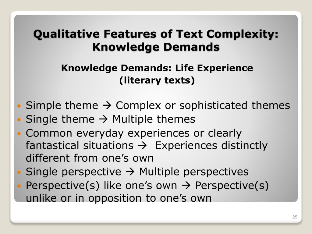 Qualitative Features of Text Complexity:Knowledge Demands Knowledge Demands: Life Experience (literary texts) Simple theme Complex or sophisticated themes Single theme Multiple themes Common everyday experiences or clearly fantastical situations Experiences distinctly different from one’s own Single perspective Multiple perspectives Perspective(s) like one’s own Perspective(s) unlike or in opposition to one’s own