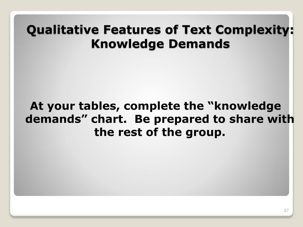 Qualitative Features of Text Complexity:Knowledge Demands At your tables, complete the “knowledge demands” chart. Be prepared to share with the rest of the group.