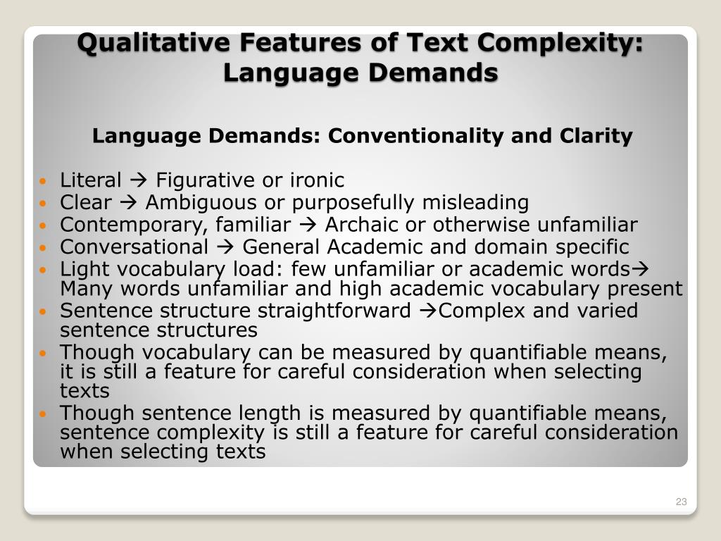 Qualitative Features of Text Complexity:Language Demands Language Demands: Conventionality and Clarity • Literal Figurative or ironic • Clear Ambiguous or purposefully misleading • Contemporary, familiar Archaic or otherwise unfamiliar • Conversational General Academic and domain specific • Light vocabulary load: few unfamiliar or academic words Many words unfamiliar and high academic vocabulary present • Sentence structure straightforward Complex and varied sentence structures • Though vocabulary can be measured by quantifiable means, it is still a feature for careful consideration when selecting texts • Though sentence length is measured by quantifiable means, sentence complexity is still a feature for careful consideration when selecting texts