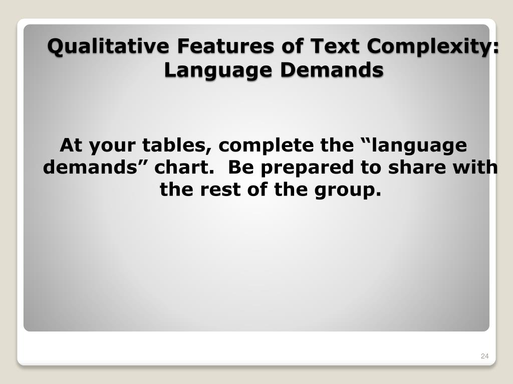 Qualitative Features of Text Complexity:Language Demands At your tables, complete the “language demands” chart. Be prepared to share with the rest of the group.