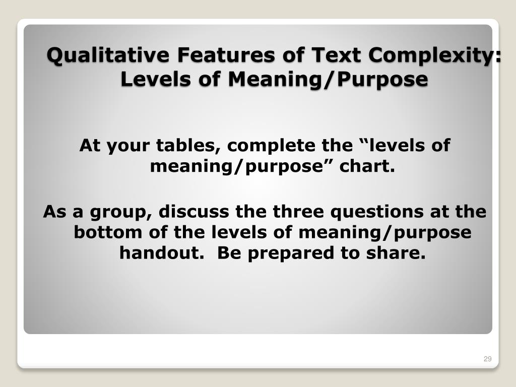 Qualitative Features of Text Complexity:Levels of Meaning/Purpose At your tables, complete the “levels of meaning/purpose” chart. As a group, discuss the three questions at the bottom of the levels of meaning/purpose handout. Be prepared to share.