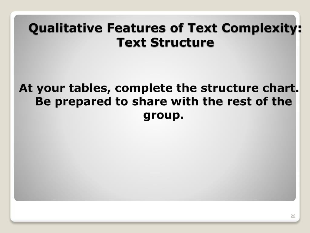 Qualitative Features of Text Complexity:Text Structure At your tables, complete the structure chart. Be prepared to share with the rest of the group.