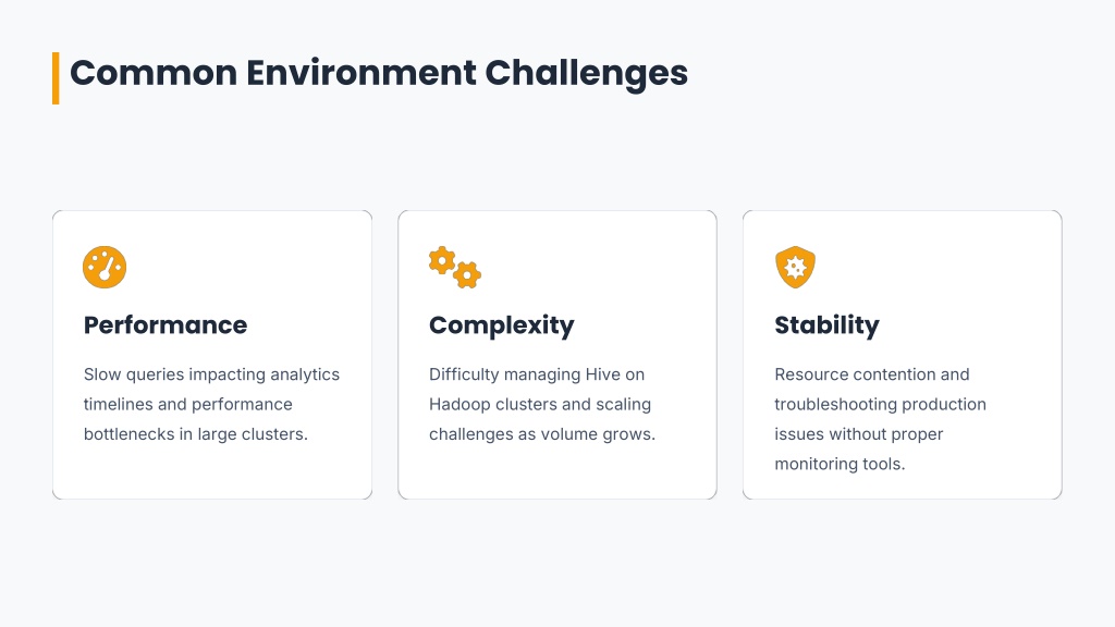 4. Common Environment Challenges Performance Complexity Stability Slow queries impacting analytics timelines and performance bottlenecks in large clusters. Difficulty managing Hive on Hadoop clusters and scaling challenges as volume grows. Resource contention and troubleshooting production issues without proper monitoring tools.