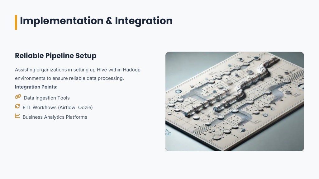 8. Implementation & Integration Reliable Pipeline Setup Assisting organizations in setting up Hive within Hadoop environments to ensure reliable data processing. Integration Points: Data Ingestion Tools ETL Workflows (Airflow, Oozie) Business Analytics Platforms