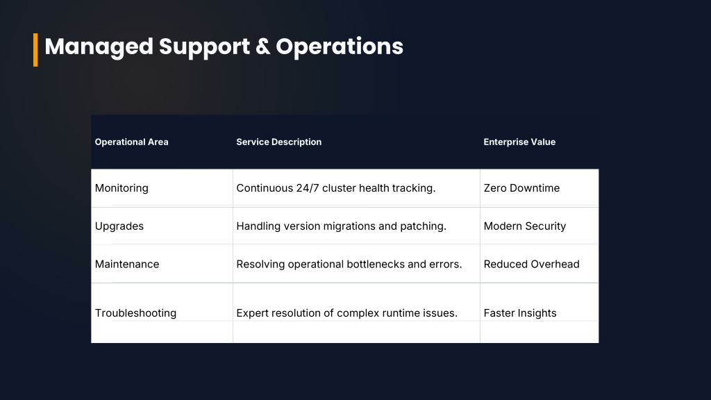 5. Role of Support Services Production Reliability Support services focus on maintaining stable and efficient Hive environments for mission-critical workloads. Core Focus Areas: Query Failure Resolution Cluster Health Monitoring Consistent Availability Assurance