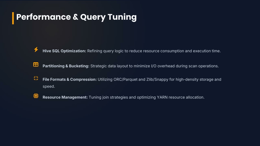 7. Performance & Query Tuning Hive SQL Optimization: Refining query logic to reduce resource consumption and execution time. Partitioning & Bucketing: Strategic data layout to minimize I/O overhead during scan operations. File Formats & Compression: Utilizing ORC/Parquet and Zlib/Snappy for high-density storage and speed. Resource Management: Tuning join strategies and optimizing YARN resource allocation.
