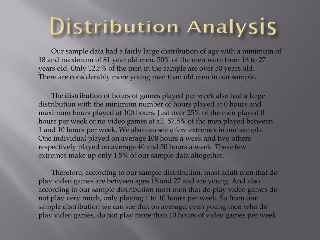 Distribution Analysis Our sample data had a fairly large distribution of age with a minimum of18 and maximum of 81 year old men. 50% of the men were from 18 to 27 years old. Only 12.5% of the men in the sample are over 50 years old. There are considerably more young men than old men in our sample. The distribution of hours of games played per week also had a large distribution with the minimum number of hours played at 0 hours and maximum hours played at 100 hours. Just over 25% of the men played 0hours per week or no video games at all. 57.5% of the men played between1 and 10 hours per week. We also can see a few extremes in our sample.One individual played on average 100 hours a week and two others respectively played on average 40 and 50 hours a week. These fewextremes make up only 1.5% of our sample data altogether. Therefore, according to our sample distribution, most adult men that doplay video games are between ages 18 and 27 and are young. And also according to our sample distribution most men that do play video games donot play very much, only playing 1 to 10 hours per week. So from our sample distribution we can see that on average, even young men who do play video games, do not play more than 10 hours of video games per week