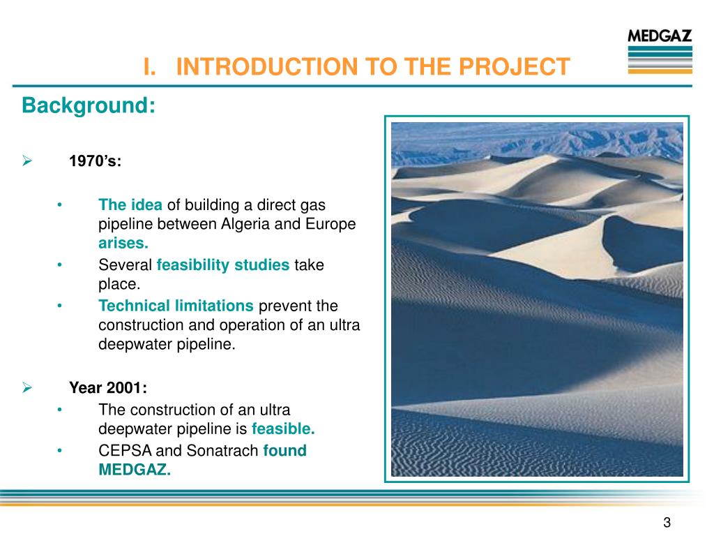 I. INTRODUCTION TO THE PROJECT Background: • 1970’s: • The idea of building a direct gas pipeline between Algeria and Europe arises. • Several feasibilitystudies take place. • Technical limitations prevent the construction and operation of an ultra deepwater pipeline. • Year 2001: • The construction of an ultra deepwater pipeline is feasible. • CEPSA and Sonatrach found MEDGAZ.