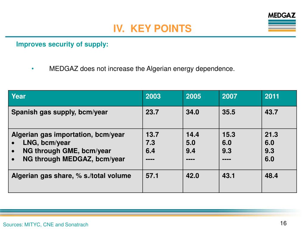 IV. KEY POINTS Improves security of supply: • MEDGAZ does not increase the Algerian energy dependence. Sources: MITYC, CNE and Sonatrach