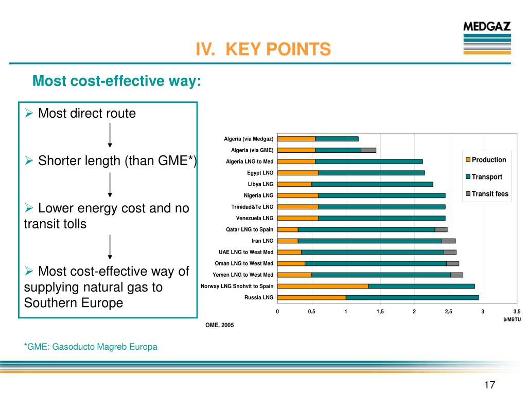 IV. KEY POINTS Most cost-effective way: • Most direct route • Shorter length (than GME*) • Lower energy cost and no transit tolls • Most cost-effective way of supplying natural gas to Southern Europe *GME: Gasoducto Magreb Europa