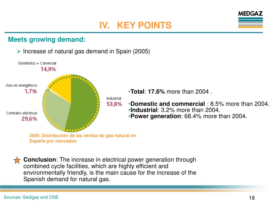 IV. KEY POINTS Meets growing demand: • Increase of natural gas demand in Spain (2005) • Total: 17.6% more than 2004. • Domestic and commercial : 8.5% more than 2004. • Industrial: 3.2% more than 2004. • Power generation: 68.4% more than 2004. 2005. Distribución de las ventas de gas natural en España por mercados • Conclusion: The increase in electrical power generation through combined cycle facilities, which are highly efficient and environmentally friendly, is the main cause for the increase of the Spanish demand for natural gas. Sources: Sedigas and CNE