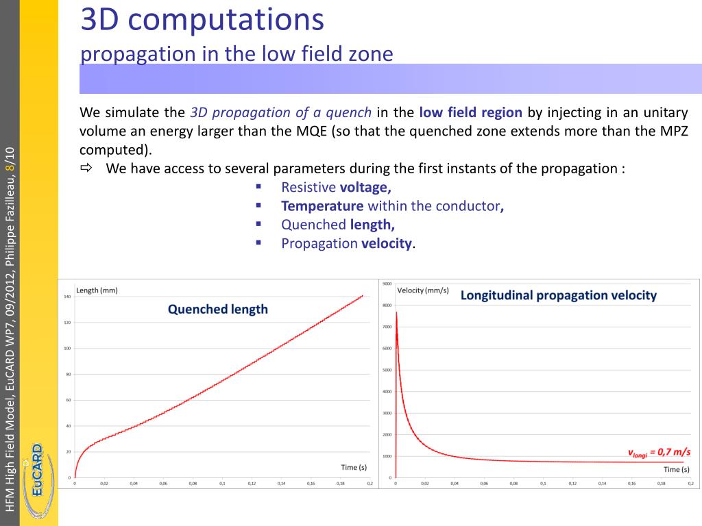 3D computations propagation in the low field zone • We simulate the 3D propagation of a quench in the low field region by injecting in an unitary volume an energy larger than the MQE (so that the quenched zone extends more than the MPZ computed). • We have access to several parameters during the first instants of the propagation : • Resistive voltage, • Temperature within the conductor, • Quenched length, • Propagation velocity.