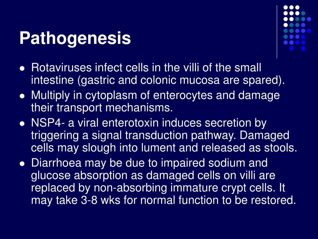 Pathogenesis • Rotaviruses infect cells in the villi of the small intestine (gastric and colonic mucosa are spared). • Multiply in cytoplasm of enterocytes and damage their transport mechanisms. • NSP4- a viral enterotoxin induces secretion by triggering a signal transduction pathway. Damaged cells may slough into lument and released as stools. • Diarrhoea may be due to impaired sodium and glucose absorption as damaged cells on villi are replaced by non-absorbing immature crypt cells. It may take 3-8 wks for normal function to be restored.