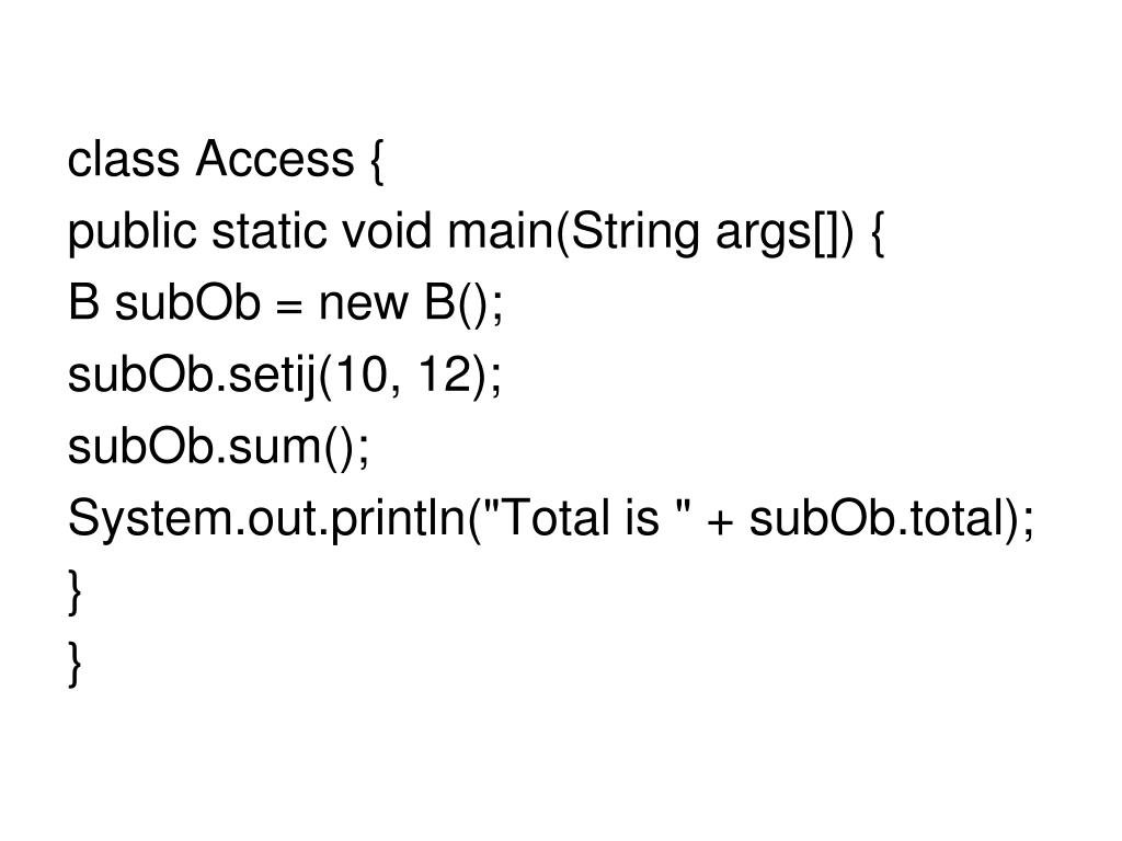 class Access { public static void main(String args[]) { B subOb = new B(); subOb.setij(10, 12); subOb.sum(); System.out.println("Total is " + subOb.total); } }