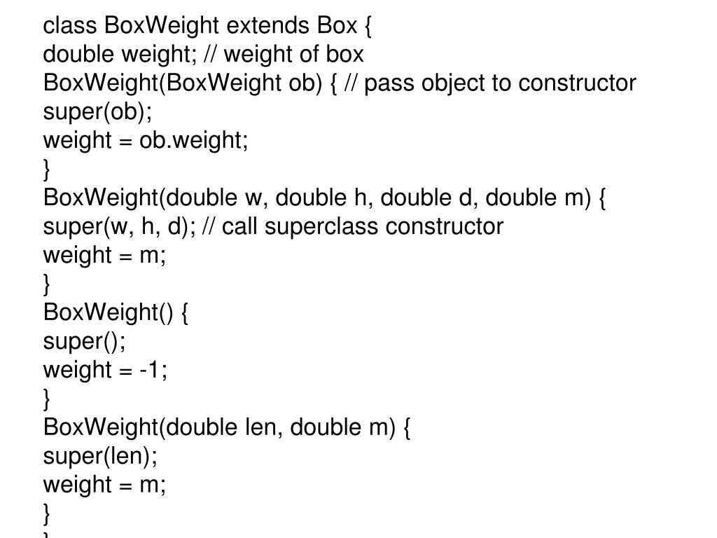 class BoxWeight extends Box { double weight; // weight of box BoxWeight(BoxWeight ob) { // pass object to constructor super(ob); weight = ob.weight; } BoxWeight(double w, double h, double d, double m) { super(w, h, d); // call superclass constructor weight = m; } BoxWeight() { super(); weight = -1; } BoxWeight(double len, double m) { super(len); weight = m; } }