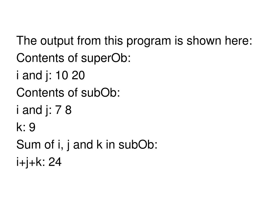 The output from this program is shown here: Contents of superOb: i and j: 10 20 Contents of subOb: i and j: 7 8 k: 9 Sum of i, j and k in subOb: i+j+k: 24
