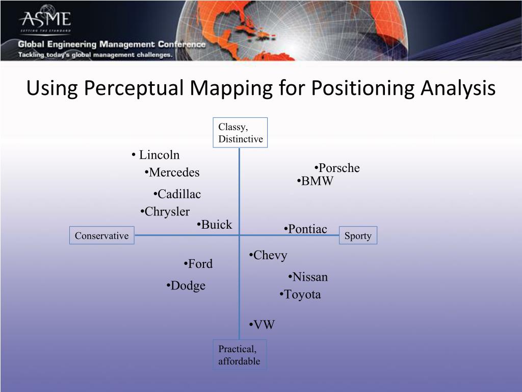 Using Perceptual Mapping for Positioning Analysis Classy, Distinctive • Lincoln • Porsche • Mercedes • BMW • Cadillac • Chrysler • Buick • Pontiac Conservative Sporty • Chevy • Ford • Nissan • Dodge • Toyota • VW Practical, affordable