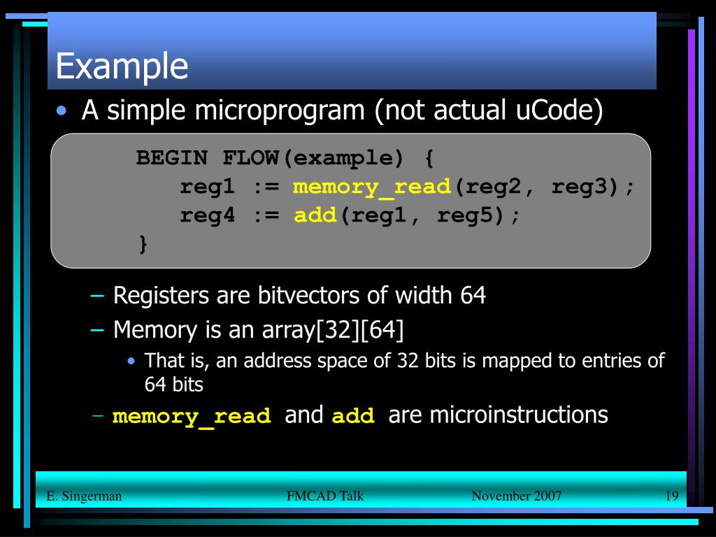 Example • BEGIN FLOW(example) { • reg1 := memory_read(reg2, reg3); • reg4 := add(reg1, reg5); • } • A simple microprogram (not actual uCode) • Registers are bitvectors of width 64 • Memory is an array[32][64] • That is, an address space of 32 bits is mapped to entries of 64 bits • memory_readand addare microinstructions FMCAD Talk November 2007