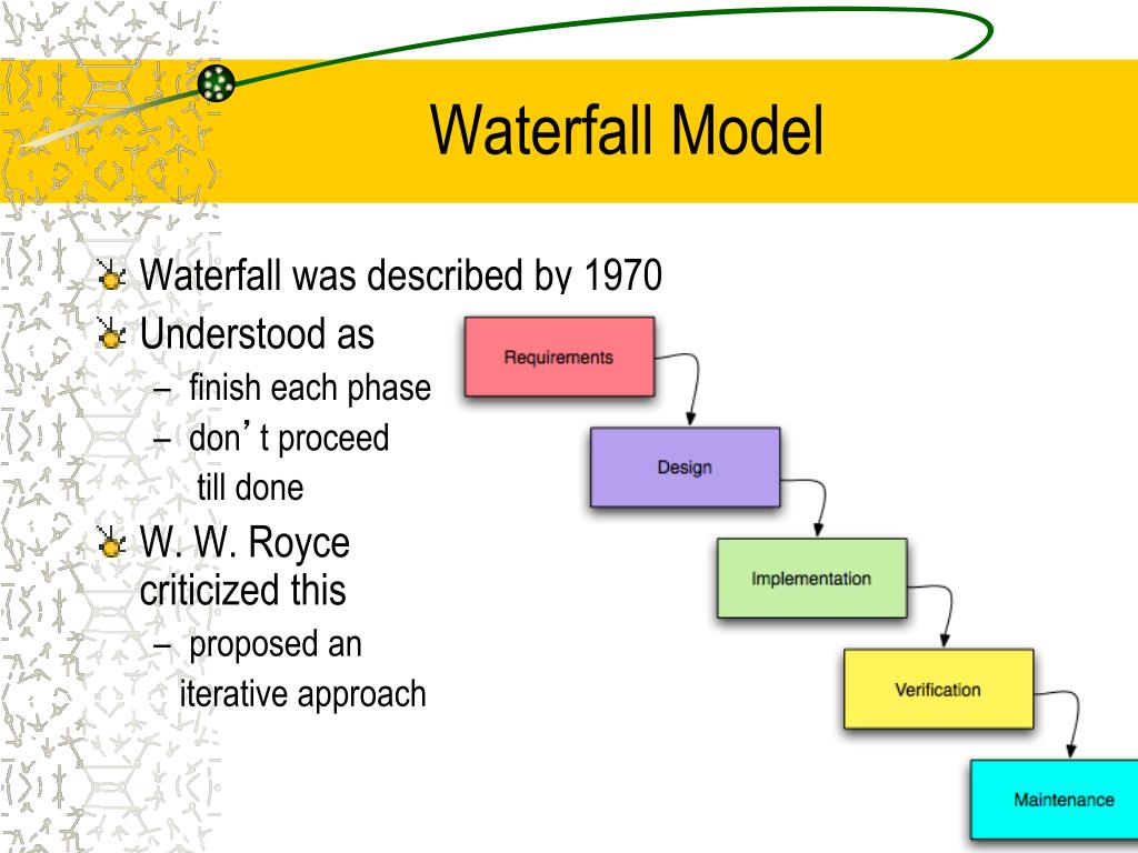 Waterfall Model • Waterfall was described by 1970 • Understood as • finish each phase • don’t proceed till done • W. W. Roycecriticized this • proposed an iterative approach