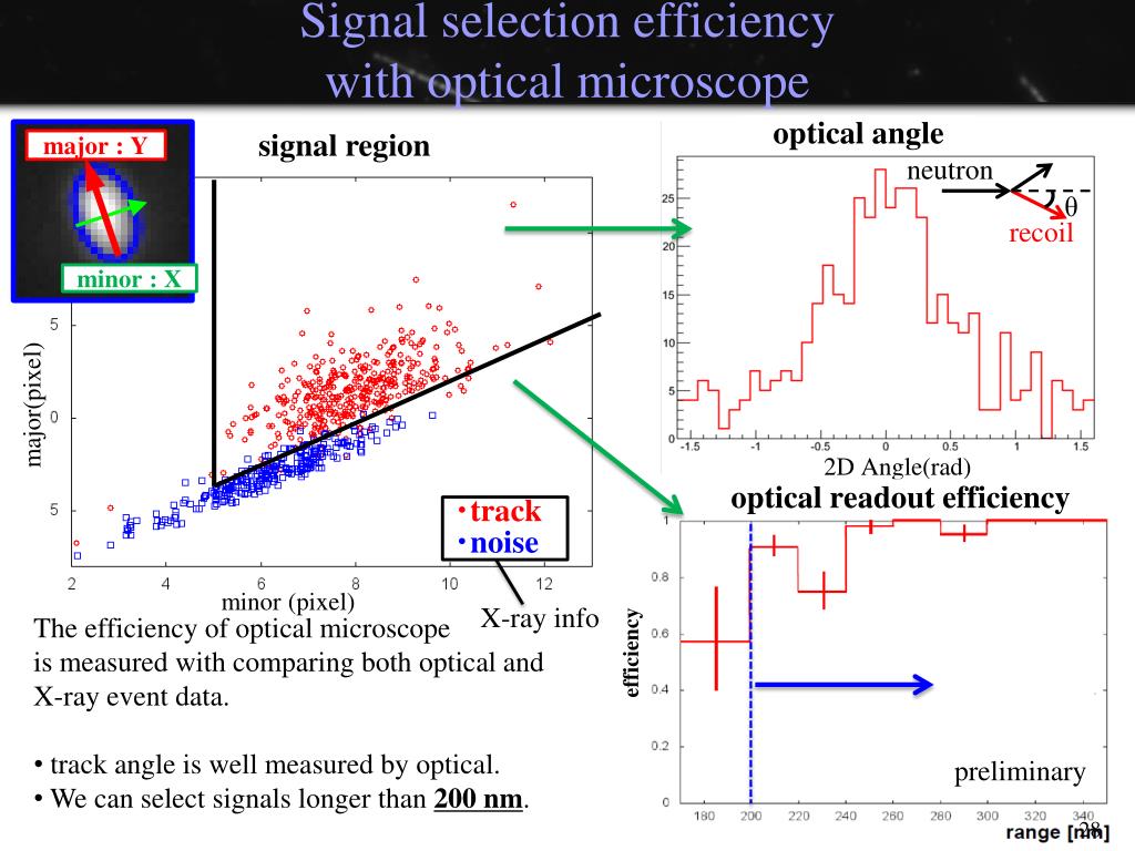 Signal selection efficiencywith optical microscope signal region optical angle neutron major : Y θ recoil minor : X major(pixel) 2D Angle(rad) optical readout efficiency ・track ・noise minor (pixel) efficiency • The efficiency of optical microscope • is measured with comparing both optical and X-ray event data. • track angle is well measured by optical. • We can select signals longer than 200 nm. X-ray info (Preliminary) preliminary