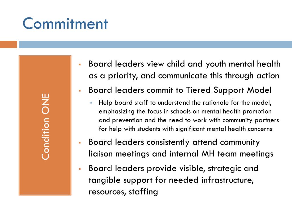 Commitment Condition ONE • Board leaders view child and youth mental health as a priority, and communicate this through action • Board leaders commit to Tiered Support Model • Help board staff to understand the rationale for the model, emphasizing the focus in schools on mental health promotion and prevention and the need to work with community partners for help with students with significant mental health concerns • Board leaders consistently attend community liaison meetings and internal MH team meetings • Board leaders provide visible, strategic and tangible support for needed infrastructure, resources, staffing