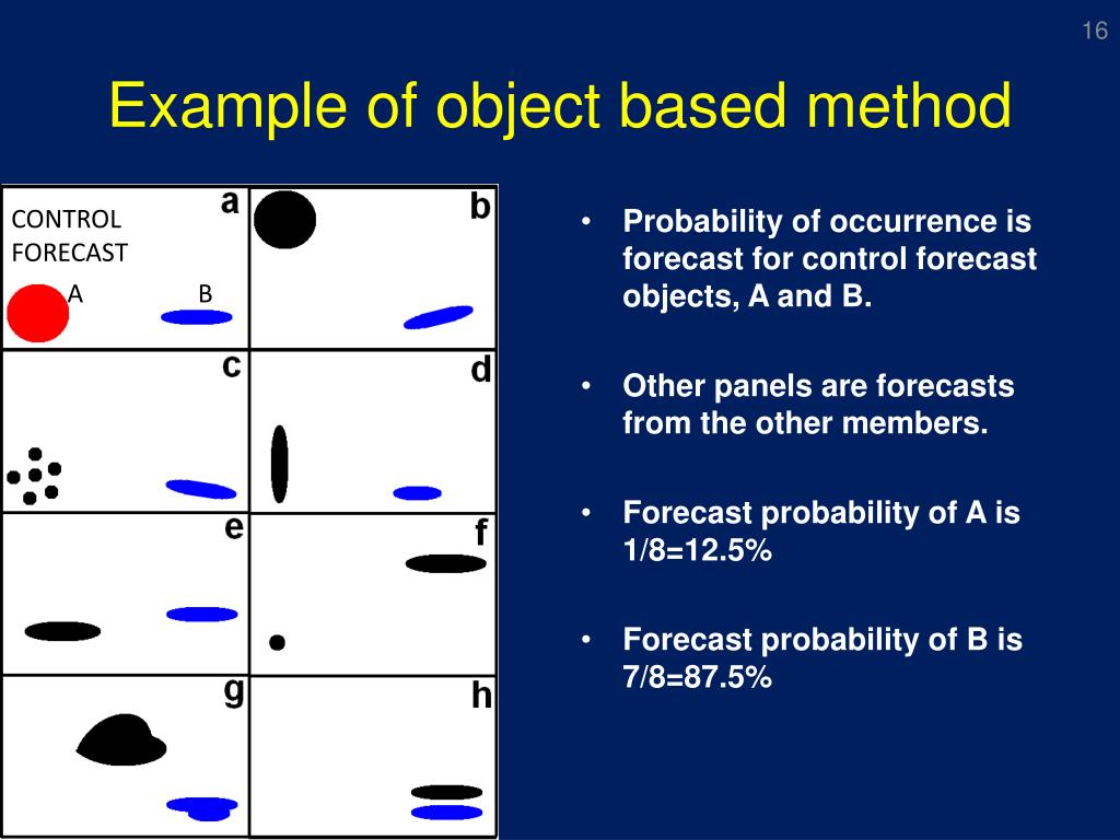 Example of object based method CONTROL FORECAST A B Probability of occurrence is forecast for control forecast objects, A and B. Other panels are forecasts from the other members. Forecast probability of A is 1/8=12.5% Forecast probability of B is 7/8=87.5%