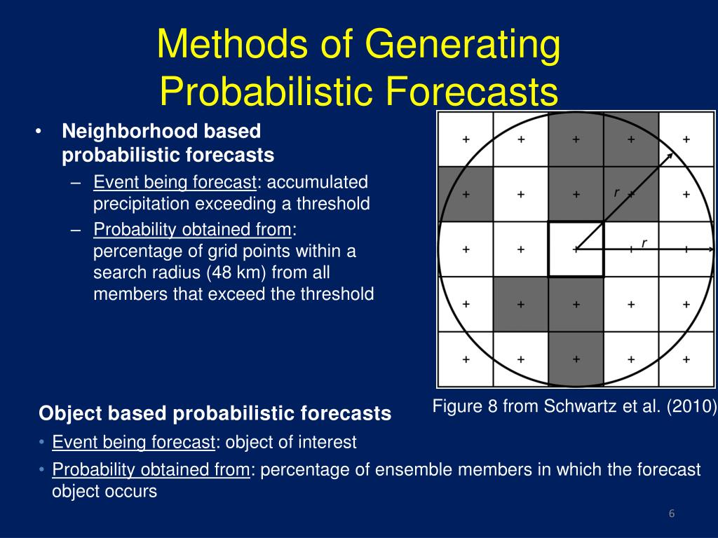 Methods of Generating Probabilistic Forecasts • Neighborhood based probabilistic forecasts • Event being forecast: accumulated precipitation exceeding a threshold • Probability obtained from: percentage of grid points within a search radius (48 km) from all members that exceed the threshold Object based probabilistic forecasts • Event being forecast: object of interest • Probability obtained from: percentage of ensemble members in which the forecast object occurs Figure 8 from Schwartz et al. (2010)