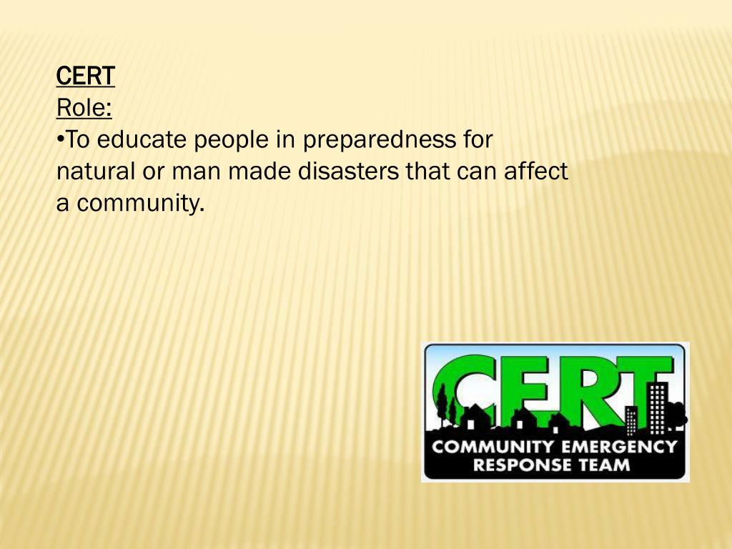 CERT • Role: • To educate people in preparedness for natural or man made disasters that can affect a community.